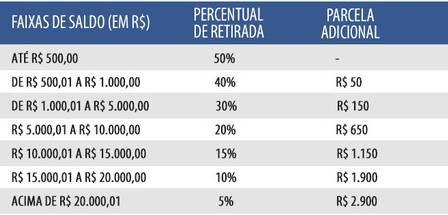 O saque-aniversário permite o resgate de 50% do fundo (para quem tem até R$ 500 na conta) até 5% (para quem tem acima de R$ 20 mil). Ou seja, o percentual vai caindo conforme a quantidade de dinheiro depositado aumenta.